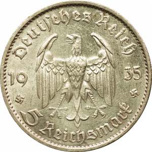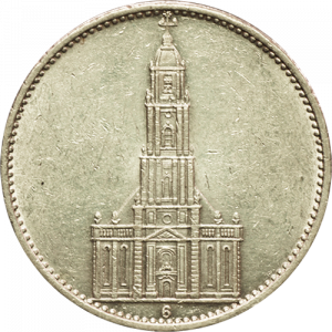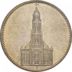 After these two single-year commemoratives, differentiation became blurred between what was a true commemorative and what was a circulating coin. Rather on the cusp was the 1934 issue of 2- and 5-reichsmark pieces commemorating the first anniversary of Nazi rule – 21 March, 1933. The reverses show the broken date (21. März and [swastika] 1933 [swastika]) on either side of the garrison church at Potsdam, a potent symbol of German pride. It was here that Frederick the Great was buried; here that the old Hohenzollern dynasty had worshipped and here that Hitler convened the Reichstag after the fire of February 27, 1933 had destroyed the old parliament buildings. Both the 2- and 5-RM with the date were single-year types and while the 2-RM was not struck again using this design, the 5-RM was. Without the anniversary date, it appeared in both 1934 and 1935 at all six mints and in quantities measured by the millions – in the case of the 1935-A(Berlin), nearly 23½-million being coined.
