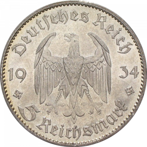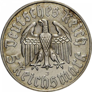 5 Reichsmark, 1933. 450th Anniversary of the birth of Martin Luther. It and its accompanying 2-RM were struck at a total of six mints. 5 RM, 1934. 175th Anniversary of the birth of Schiller. It and its accompanying 2-RM were coined only at the Stuttgart (F) mint.