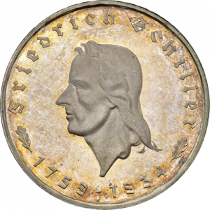 5 RM, 1934. 175th Anniversary of the birth of Schiller. It and its accompanying 2-RM were coined only at the Stuttgart (F) mint.