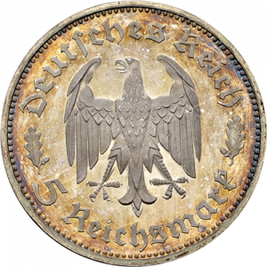 Adolph Hitler inherited an in-place, vibrant numismatic market from the very Weimar Republic he helped bury. Since 1925, the Republic had been issuing commemorative silver coins at the rate of one to four issues per year. Even when the mintage-sets were widened to include the products of several different mints, numbers and quality were such that collectors worldwide were generally very satisfied. Designs were attractive if not artistically remarkable; struck in .500 silver, the size of the usual 3- and 5-mark pieces appeared substantial; and mintages were high enough to satisfy all immediate comers, low enough to ensure their “investment” would show future gains.