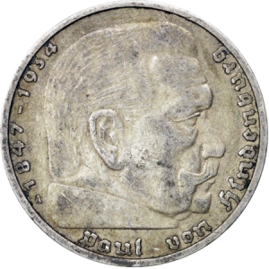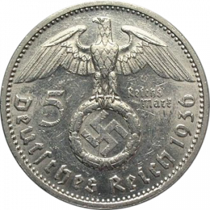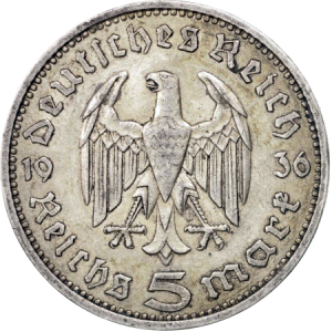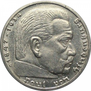 The silver 2-RM, which had never been issued as a Type-1 Hindenburg, re-joined the ranks with the modified reverse in 1936. Both it and the 5-RM were coined at all six mints – seven as of 1938 when Austria and its Vienna Mint (B) were absorbed into the Reich. Neither were coined after 1939 with the outbreak of the war and while mintage figures are given below, some mean very little since they were quietly withdrawn and the silver diverted to other war needs.