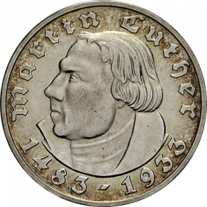 5 Reichsmark, 1933. 450th Anniversary of the birth of Martin Luther. It and its accompanying 2-RM were struck at a total of six mints