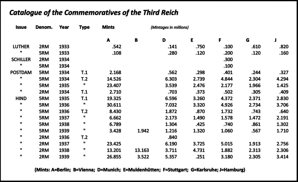 After Hitler came to power in March, 1933, the early commemoratives of his regime tended to follow the lines of his Weimar predecessors, the first two being a set of 2- and 5-reichsmark pieces of Martin Luther and a similar set struck in the next year for Schiller. The Luther issue was struck at all six mints (A=Berlin, D=Munich, E=Muldenhütten, F=Stuttgart, G=Karlsruhe, J=Hamburg. After Austria was taken over in 1938, the set was joined by B=Vienna) but the Schiller only at Stuttgart.
